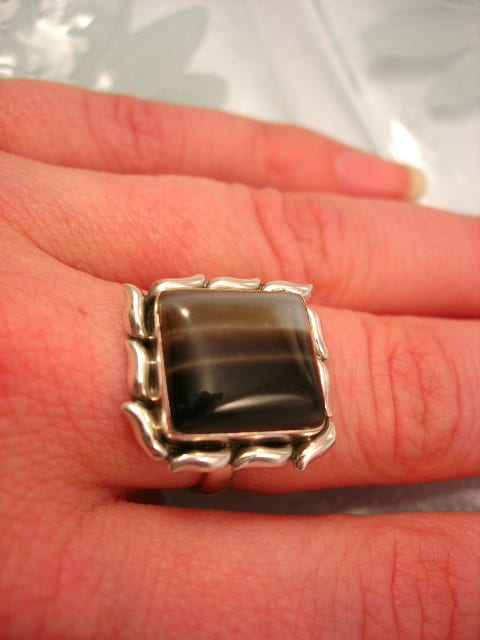 Handgjort sterling silverhänge med cabochonslipad Bandagat, 4 cm lång och 2,5 cm bred.