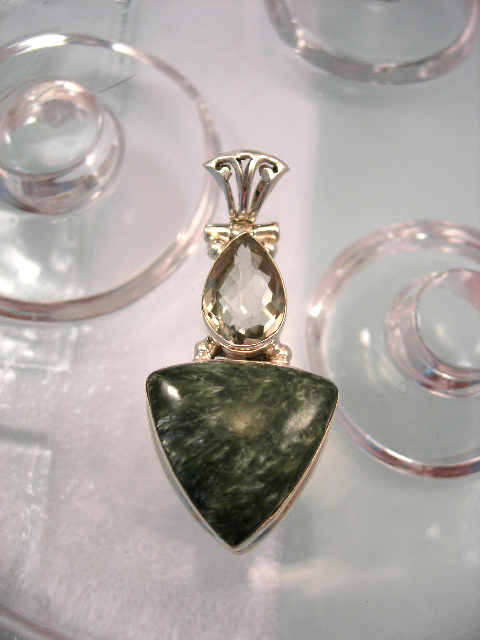 Sterling silverhänge med fasettslipad grön Ametist och cabochonslipad Serafinit, 5,2 cm lång och , 2,5 cm bred som bredast. Väger 10 gram.