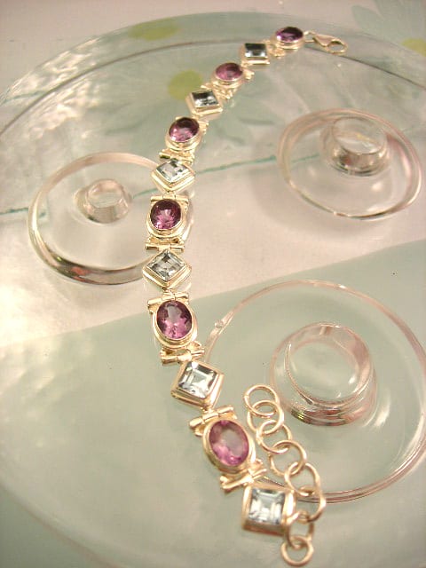 Handgjort sterling silverarmband med fasettslipade Ametister och Topaser, 21 cm långt det går att fästa på 20,5, 20, 19,5, 19, 18,5 och 18 cm. Armbandet är 11 mm brett och väger 31 gram. Varje sten är ca 8 mm stor.