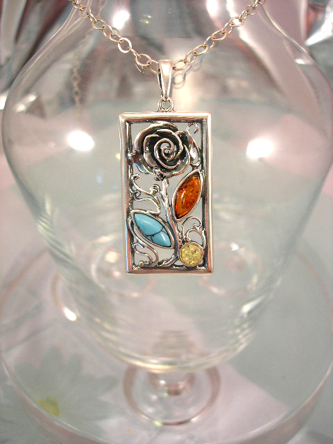 Det här hänget uppvisar ännu ett exempel på den vackra, detaljerade design som är kännetecknande för era smycken. Silverrosen med blad av turkos och bärnsten var omöjlig att motstå!
