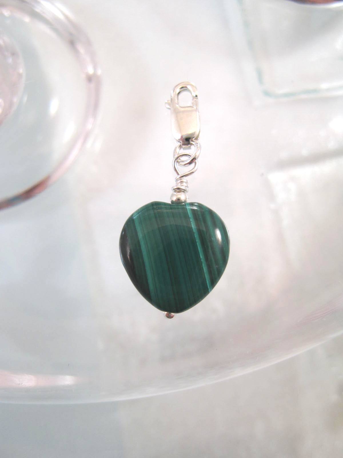 Sterling silver berlock med Malakit hjärta 1,4 cm långt inklusive karbinlåset och 1,2 m cm brett som bredast.