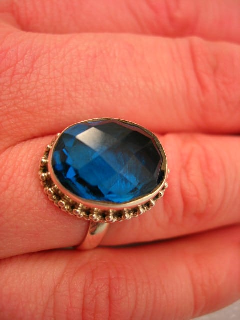 Sterling silverring med fasettslipad blå Kvarts, skölden är 2 x 1,4 cm. Storlek 16.75.
