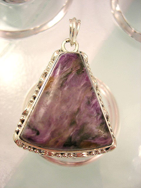 Sterling silverhänge med cabochonslipad Charoit, 4,7 cm långt och 3,5 cm brett som bredast. Väger 22 gram.