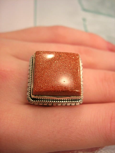 Handgjord sterling silverring med cabochonslipad Guldsten, ca 2 x 2 cm. Storlek 18.50.