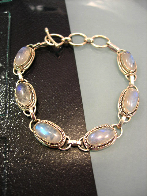 Sterling silverarmband med cabchonslipade Månstenar, 22 cm långt och går att fästa på 22 cm, 20,5 cm och 19 cm. Armbandet är ca 1,3 cm brett som bredast. Väger 24 gram.