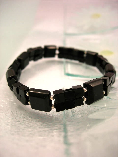 Handgjort armband på töjbar tråd med Onyxkuber, plattor och sterling silverkulor.