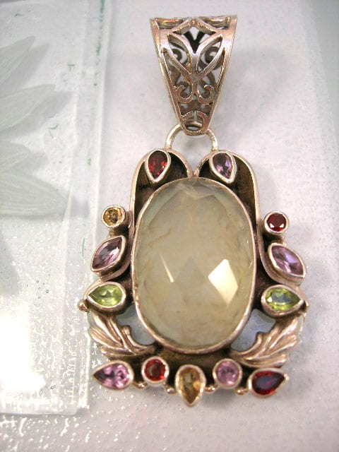 Handgjort sterling silverhänge med fasettslipad Prenit, Ametist, Citrin, Granat & Peridot, 6 cm långt inklusive hängöglan och 3,4 cm brett. Väger 17 gram.