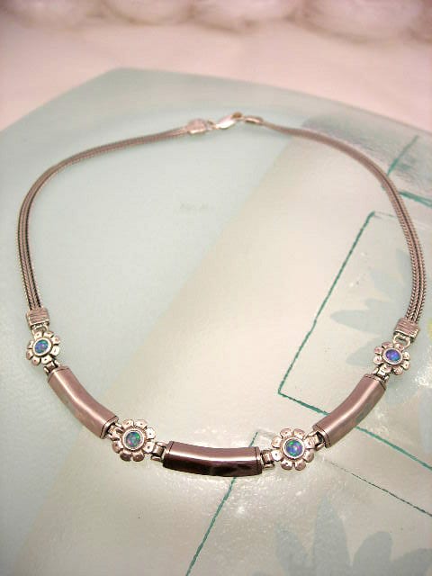 Handgjort sterling silverhalsband med syntetiska Opaler, halsbandet är 43 cm långt. Blommorna är 1 cm i diameter. Väger 22 gram.