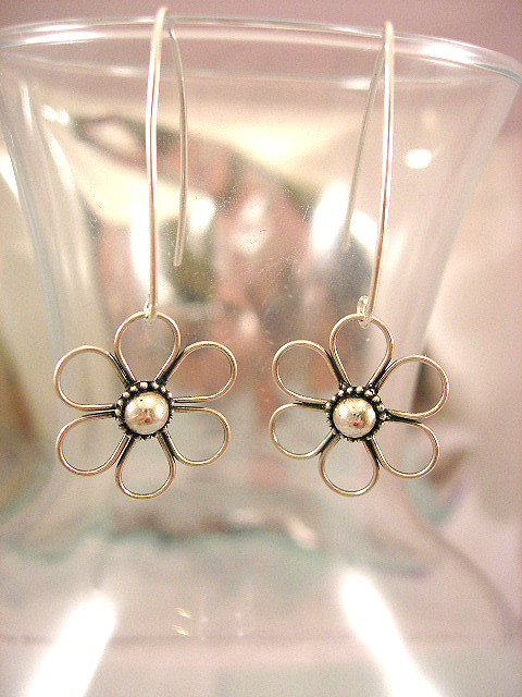 Handgjorda sterling silverörhängen med Daisyblommor, ca 5 cm långa inklusive kroken och 2 cm breda som bredast.